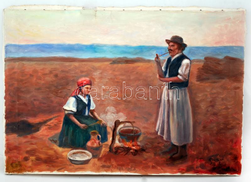 Beschreibung: Bihari jelzéssel: Bográcsozás délibábbal, olaj, vászon, 41,5×60 cm