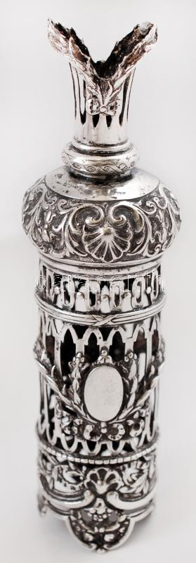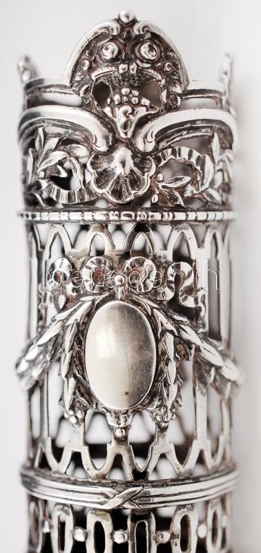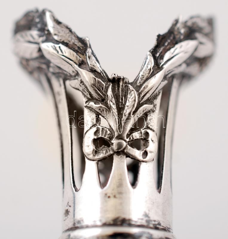 Beschreibung: Dekoratív, növényi motívumokkal rendkívül gazdagon díszített ezüst (Ag.) tartó, jelzés nélkül, m: 17 cm, nettó 117 g