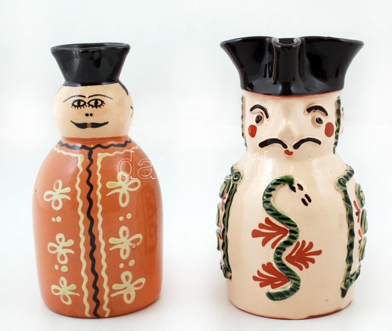 Beschreibung: 2 db Miksa kancsó, kézzel festett, mázas keménycserép, egyik jelzett(KZ), máz hibákkal, m:18 és 19 cm