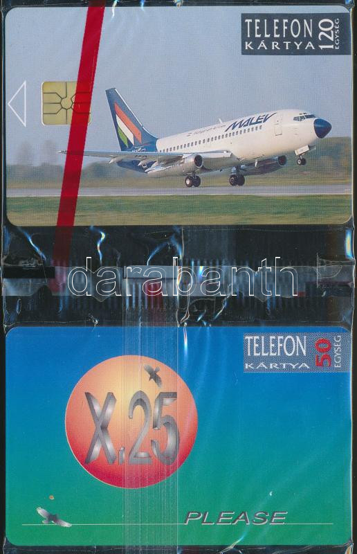 Beschreibung: 1992-93 MALÉV telefonkártya bontatlan, 120 egység,+Please x.25 telefonkártya bontatlan, 50 egység