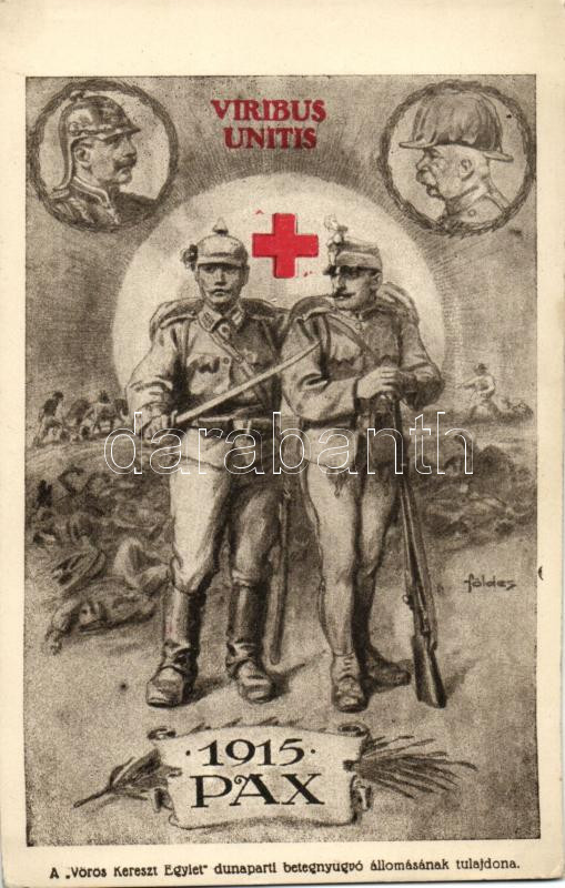 1915 Pax, Viribus Unitis, Vörös Kereszt Egylet dunaparti betegnyugvó állomásának tulajdona / WWI Hungarian Red Cross propaganda, Franz Joseph, Wilhelm II s: Földes