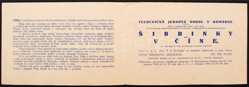 Beschreibung: 1933 Komárno (Komárom), szlovák nyelvű meghívó Kínáról szóló ismeretterjesztő rendezvényre, díszes elülső borítóval