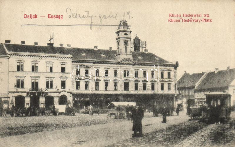 Eszék, Osijek, Essegg; Khuen Héderváry Platz / square with shops, tram https://www.darabanth.com/de/24-Gross-Auktion/24.1/Ansichtskarten-Ungarn/Kroatien~9443/Eszek-Osijek-Essegg-Khuen-Hedervary-Platz-square-with-shops-tram~II1283893
