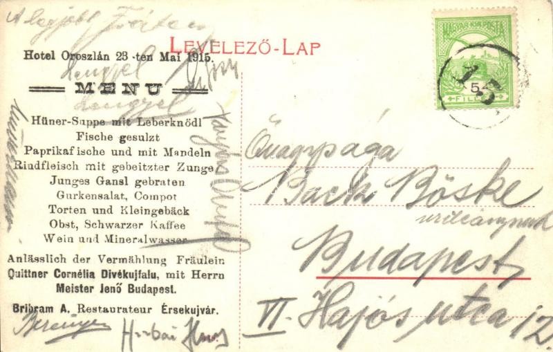Beschreibung: Érsekújvár, Nove Zamky; Vasútállomás, hátoldalon a Hotel Oroszlán 1915. május 23-i étlapja / railway station