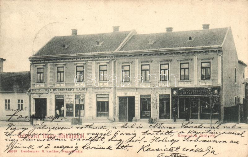 Nagymihály, Mihalovce; Főtér, gyógyszertár, 'Fűszer és Vasraktár', Bucsinszky Lajos üzlete, italbolt, kiadja Landesman / main square, pharmacy, 'Spice and ironware depot', shop, alcohol shop