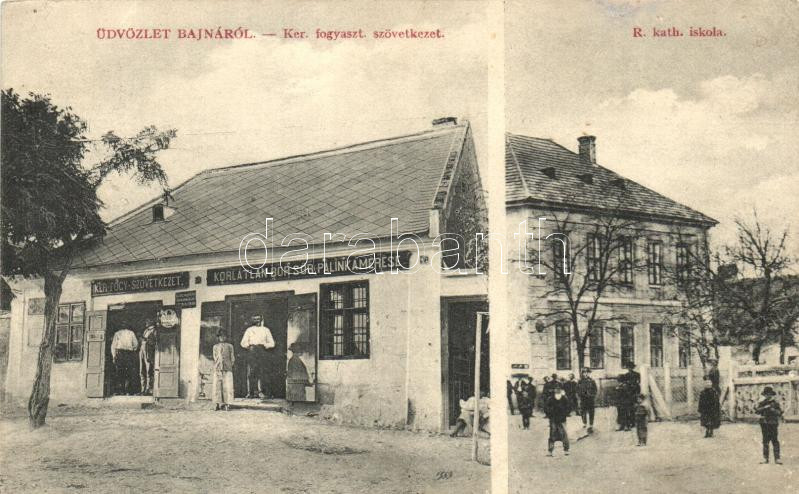 Bajna, a Ker. Fogyasztási Szövetkezet üzlete, 'Korlátlan Bor, Sör, Pálinkamérése' italbolt, Római Katolikus iskola, kiadja a bajnai Fogyasztási Szövetkezet