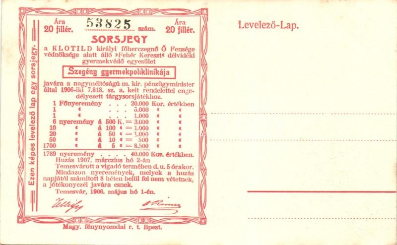 Beschreibung: Budapest V. Szabadság tér, Schreiber City Kávéház, a hátoldalon a 'Fehér Kereszt' délvidéki gyermekvédő egyesület sorsjegye