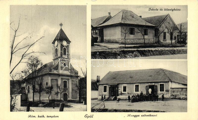 Beschreibung: Epöl, Római Katolikus templom, Iskola és községháza, Hangya Szövetkezet, kiadja az epöli Hangya Szövetkezet