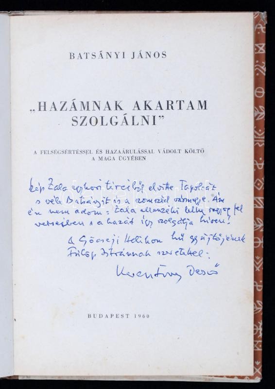 Batsányi János: Hazámnak akartam szolgálni. Sajtó alá rendezte Kereszt... https://www.darabanth.com/de/24-Gross-Auktion/24.1/Kunst-Dokumente/Bucher-Sonstige-Raritaten~9338/Batsanyi-Janos-Hazamnak-akartam-szolgalni-Sajto-ala-rendezte-Keresztury-Dezso-Bp-1960-M~II1281254