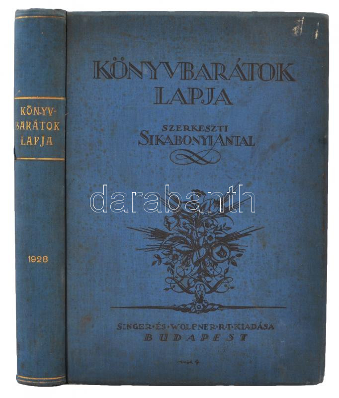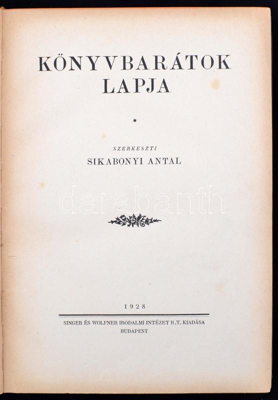 Könyvbarátok Lapja. Könyvtörténeti és bibliofil szemle. Szerk. Sikabonyi Antal. 1. évf. 1-4. sz. egybekötve. Bp., 1927. okt.-dec. - 1928. júl.-szept., Singer és Wolfner. 328 p. A borítékot és a folyóirat díszeit Végh Gusztáv készítette. Teljes, több száma nem jelent meg. Kiadói, kissé kopott, festett vászonkötésben. Az eredeti borítók hátul belekötve.