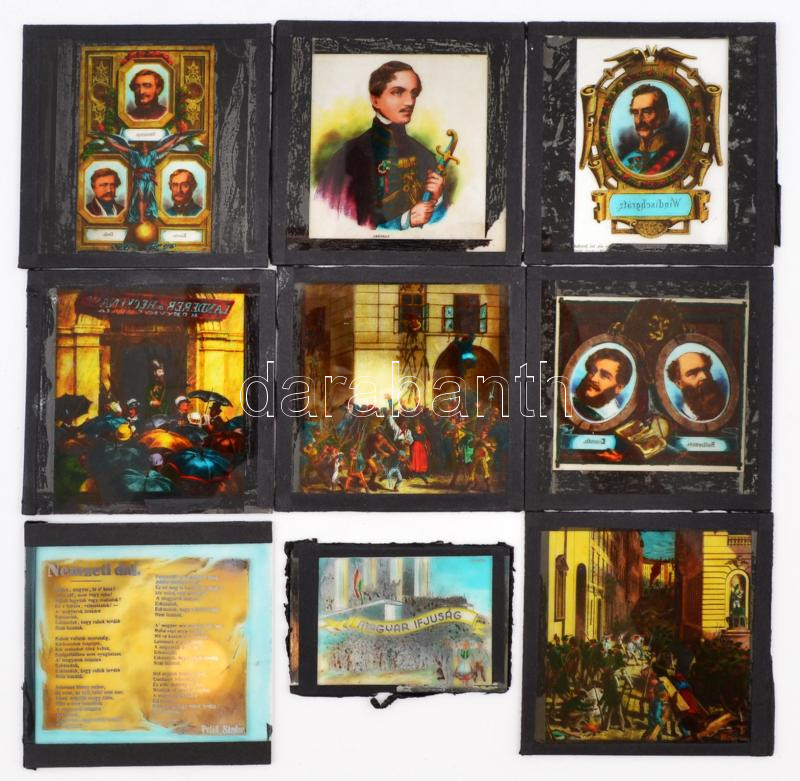 1848 Március 15. eseményei és szereplÅ‘i, 1948-ban készÃtette Fekete György (1904-1990) budapesti fényképész - reprodukciók korabeli rajzokról, metszetekrÅ‘l, amelyeket üveglemez diapozitÃvra másolt, majd kézzel szÃnezett, és a mozikban, a nagyfilm elÅ‘tt vetÃtett, 9 db üveglemez diapozitÃv kép, 8x8 cm és 5x7 cm