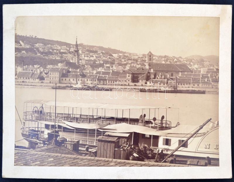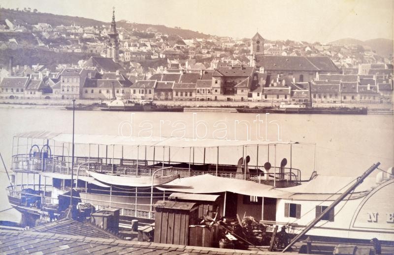 cca 1890 Budapest, Tabán nagyméretű fotó a városrendezés előtti Duna parttal. Régi házak, műhelyek, cégek. Előtérben a Neptun, a Pontius és a Salvator lapátkerekes gőzös hajókkal. A háttérben a tabáni templom ideiglenes kupolával / Vintage photo of the Taban and steamer ships 30x23 cm