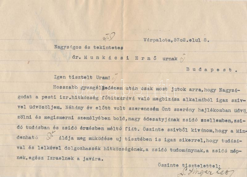 1942 dr. Singer Leó várpalotai rabbi saját kézzel aláírt levele. / Aut... https://www.darabanth.com/de/24-Gross-Auktion/24.1/Kunst-Dokumente/Judaica~9314/1942-dr-Singer-Leo-varpalotai-rabbi-sajat-kezzel-alairt-levele-Autograph-signed-letter-of-~II1282131