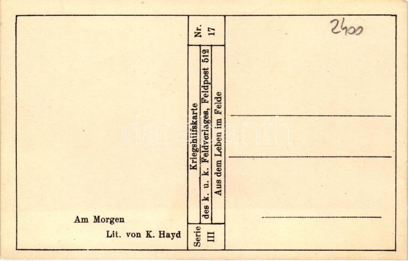 Am Morgen; Kriegshilfkarte des K.u.K. Feldverlages, Feldpost 512 Aus d... https://www.darabanth.com/de/24-Gross-Auktion/24.1/Thematik-und-Kunstlerkarten/Militaria~9507/Am-Morgen-Kriegshilfkarte-des-KuK-Feldverlages-Feldpost-512-Aus-dem-Leben-im-Felde-Serie-III-N~II1032372