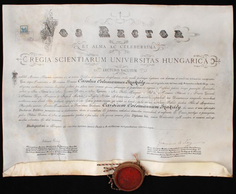 1916 Államtudományi diploma pergamenen, függő viaszpecséttel https://www.darabanth.com/de/240-Fernauktion/240.0/Andere-Sammelgebiete/Dokument~20024/1916-Allamtudomanyi-diploma-pergamenen-fuggo-viaszpecsettel~II1098265