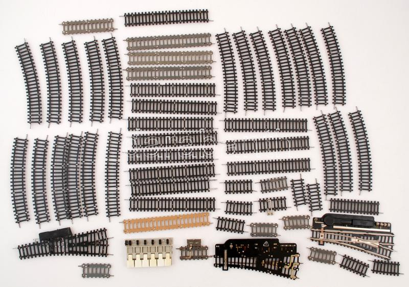 Beschreibung: Vasútmodell tétel: 21 db kanyarodó sín, 16 db egyenes sín, 16 db rövid sín, 3 db váltó, 1 db elosztó, összesen 57 db