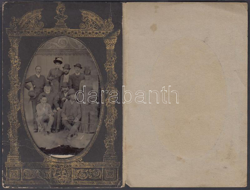 cca 1880-1910 Csoportkép, ferrotípia Horváth Zsigmond margitszigeti "első amerikai gyors fényképészetéből", az alján sérült, díszes papírtokban, 8,7×6,1 cm
