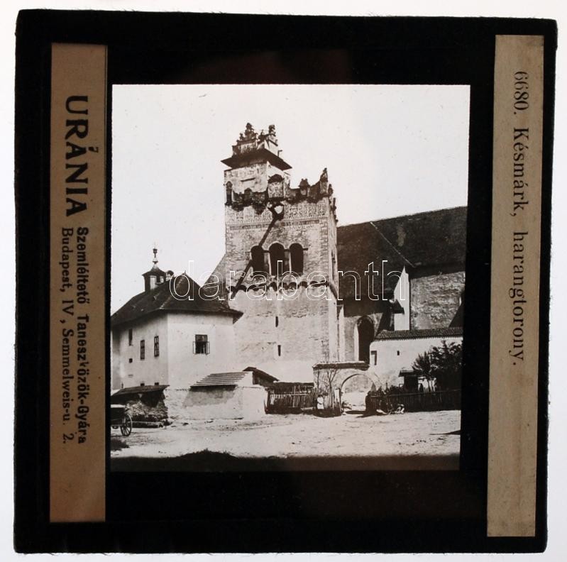 cca 1920 Felvidéki fotótörténeti leletek: Igló, Garamszentbenedek, Késmárk, Kassa - 4 db Uránia Szemléltető és Taneszközök Gyára által készített és kiadott vetíthető üveglemez diapozitív kép, 8x8 cm