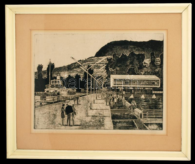 Beschreibung: Stettner Béla (1928-1984): Badacsonyi kikötő. Rézkarc, papír, jelzett, üvegezett keretben, 28×40 cm