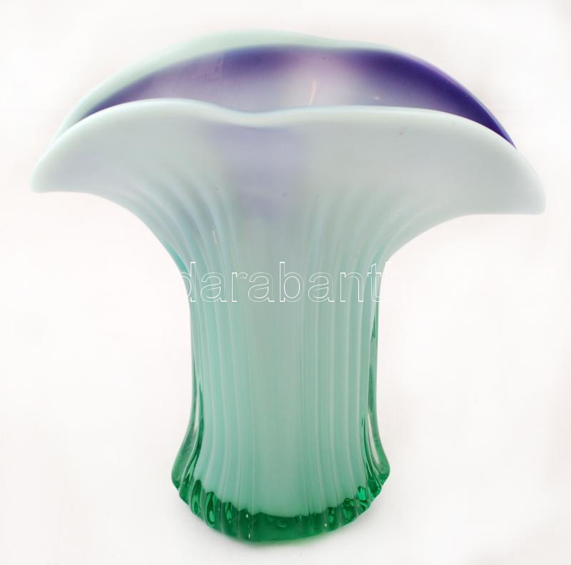 Beschreibung: Horváth Márton (1941-2013): Díszváza, többrétegű zöld-lila üvegváza, hibátlan, jelzett, m: 23 cm