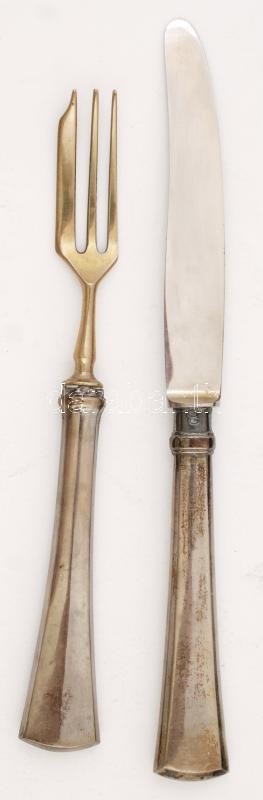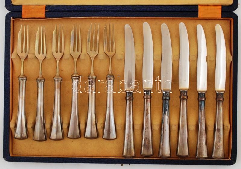 Beschreibung: Desszertes evőeszköz készlet, ezüst nyéllel, jelzett, Ag, br.:290gr, díszdobozban