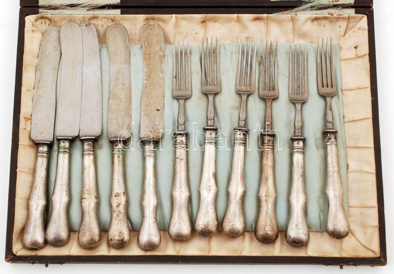 Beschreibung: Ezüstnyelű(Ag) 6 személyes étkészlet, hiányos (6 villa, 5 kés), br: 441 g