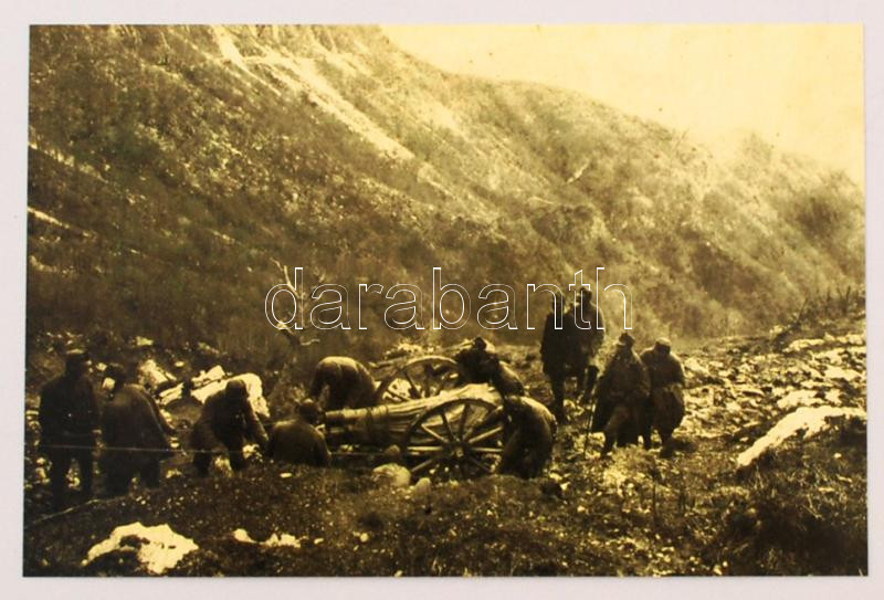 Beschreibung: cca 1916-1918 Škoda löveg a Dolomitokban, korabeli fotóról készült modern másolat, hátulján feliratozva, 10×15 cm