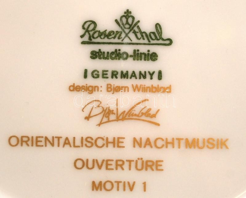 Rosenthal Keleti éjjeli muzsika 1. porcelán falitányér, hibátlan, jelz... https://www.darabanth.com/de/240-Fernauktion/240.0/Andere-Sammelgebiete/Porzellan~20010/Rosenthal-Keleti-ejjeli-muzsika-1-porcelan-falitanyer-hibatlan-jelzett-d-15-cm~II1117969