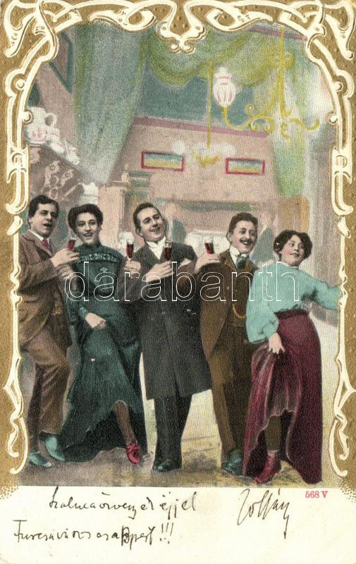 Party, champagne toast, golden decoration, Art Nouveau (EK) https://www.darabanth.com/de/240-Fernauktion/240.0/Ansichtskarten/Bier-Alkohol-Tabak~42/Party-champagne-toast-golden-decoration-Art-Nouveau-EK~II949118