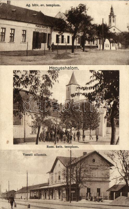Beschreibung: Hegyeshalom, Ágostoni hitvallású evangélikus és római katolikus templom, Pamer Márton mészáros és hentes üzlete, vasútállomás (EK)