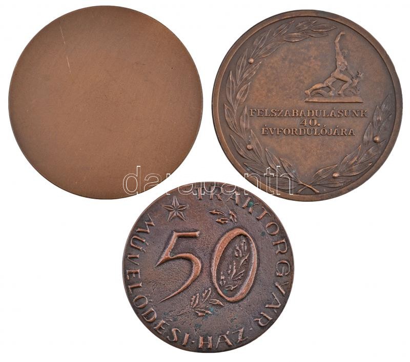 1973. "Traktorgyár Művelődési Ház 50 év / 1923-1973" Br emlékérem (62mm) + 1985. "A Szövetkezeti Mozgalom Szolgálatáért 1945-1985 / Felszabadulásunk 40. évfordulójára" Br emlékérem (70mm) + DN "A Vállalat Kiváló Ifjúsági Brigádja" Br emlékplakett (70mm) T:2,2-
