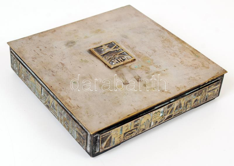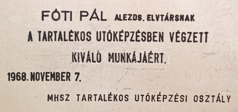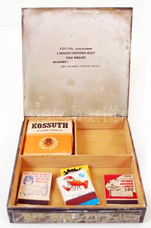 1968 MHSZ faberakásos, katonai motívumokkal gazdagon díszített alpakka doboz, "Fóti Pál alezredes elvtársnak a tartalékos utóképzésben végzett kiváló munkájáért, 1968. november 7., MHSZ Tartalékos Utóképzési Osztály" felirattal, 16×16×3,5 cm, benne 1 db bontatlan csomag Kossuth cigarettával, valamint 4 db különféle külföldi gyufával