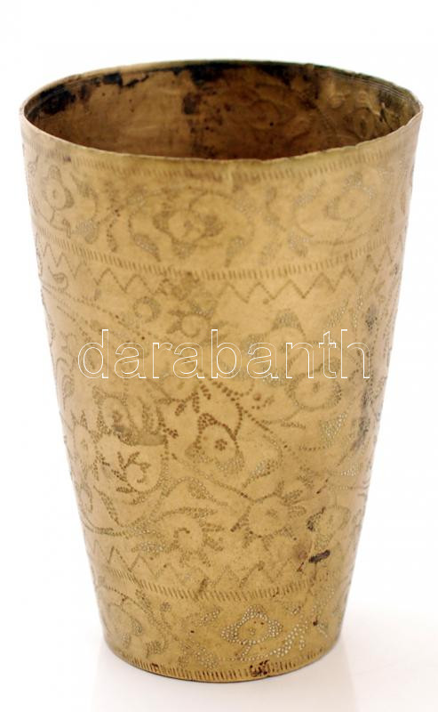 Beschreibung: Emlék pohár, réz, I világháborús hadifogoly munka, vésett virág motívumokkal, peremén kisebb horpadások, m:10,5 cm