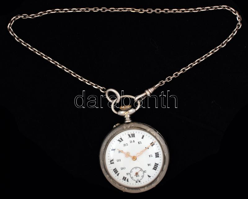 Ezüstözött fém zsebóra, óralánccal, másodpercmutatóval, üveglapján karcolással, egyébként szép állapotban, működik /