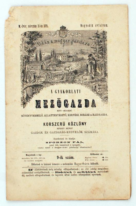 1875 A gyakorlati mezőgazda. Korszerű közlöny. Szerk.: Sporzon Pál. 4.... https://www.darabanth.com/de/242-Fernauktion/242.0/Andere-Sammelgebiete/Drucksachen~200007/1875-A-gyakorlati-mezogazda-Korszeru-kozlony-Szerk-Sporzon-Pal-4-evf-9-sz-tetejen-k~II1132426