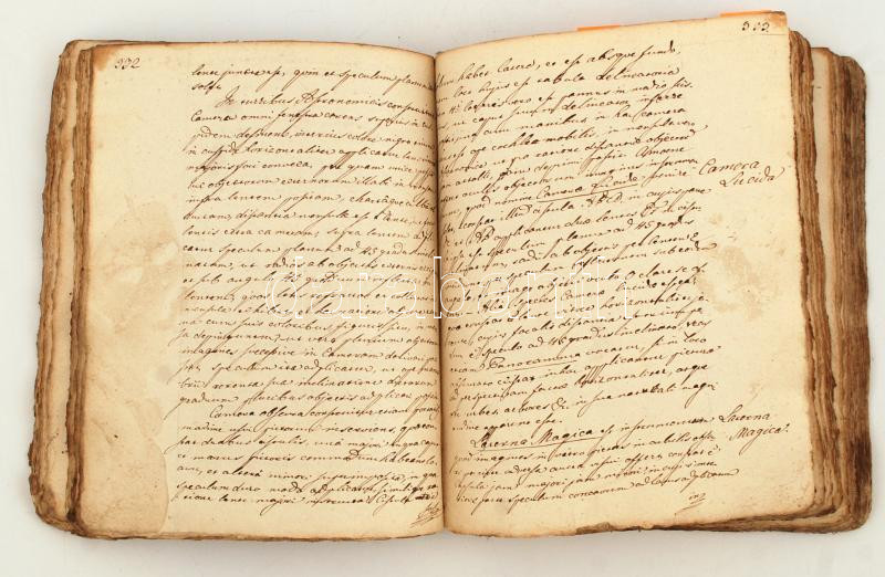 1826 Kéziratos fizika könyv, kb 300 oldalon, latin nyelven, néhány ébréval, érdekes írásokkal pl.: laterna magica, elektromosság. Megszakadó, majd újra kezdődő oldalszámozással, kissé sérült borítóval / 1826 Hand written physics book in latin, with some figures in tattered binding