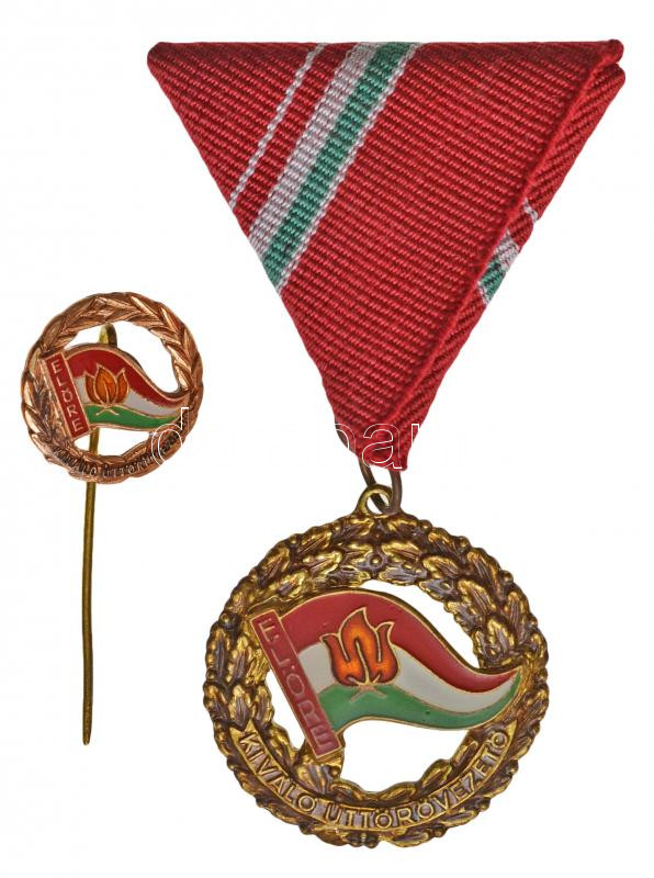 Beschreibung: ~1970. "Előre - Kiváló Úttörővezető" aranyozott, zománcozott kitüntetés mellszalaggal adományozói dísztokban, miniatűrrel T:1