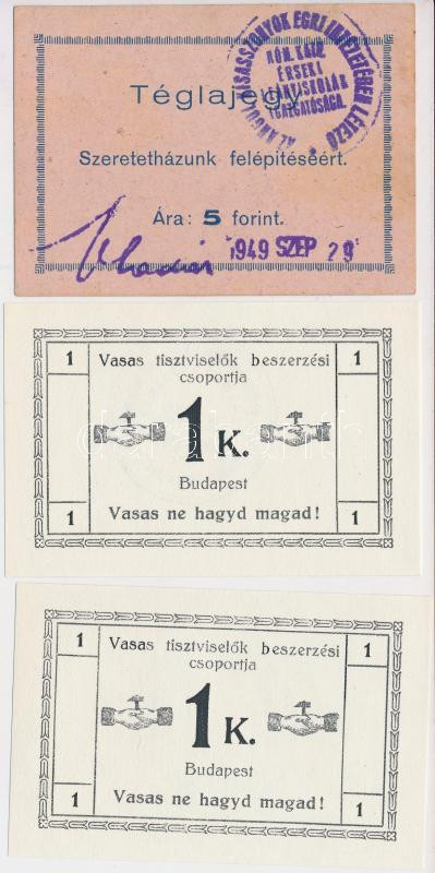 Budapest ~1920. 1K "Vasas tisztviselők beszerzési csoportja" szükségpénz, hátlapon körbélyegzővel (2x) + Eger 1949. "Az Angolkisasszonyok Egri Intézetében Létező Római Katolikus Érseki Leányiskolák Igazgatósága - Szeretetházunk felépítéséért" 5Ft értékű téglajegy, bélyegzéssel T:I,I-