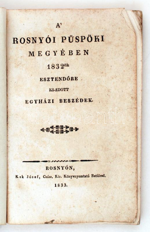 A Rosnyói püspöki megyében 1832-dik esztendőre kiadott egyházi beszédek. Rosnyón, 1833. Kek József Csász, Kir. könyvnyomtató betűivel. Korabeli papírkötésben 108+ 26p.