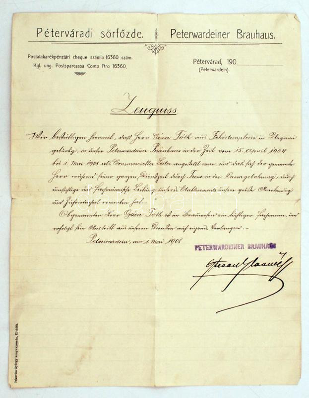 1908 A Péterváradi sörfőzde által kiállított bizonyítvány német nyelve... https://www.darabanth.com/de/243-Fernauktion/243.0/Andere-Sammelgebiete/Dokument~400025/1908-A-Petervaradi-sorfozde-altal-kiallitott-bizonyitvany-nemet-nyelven---1908-Peterwarde~II1147367