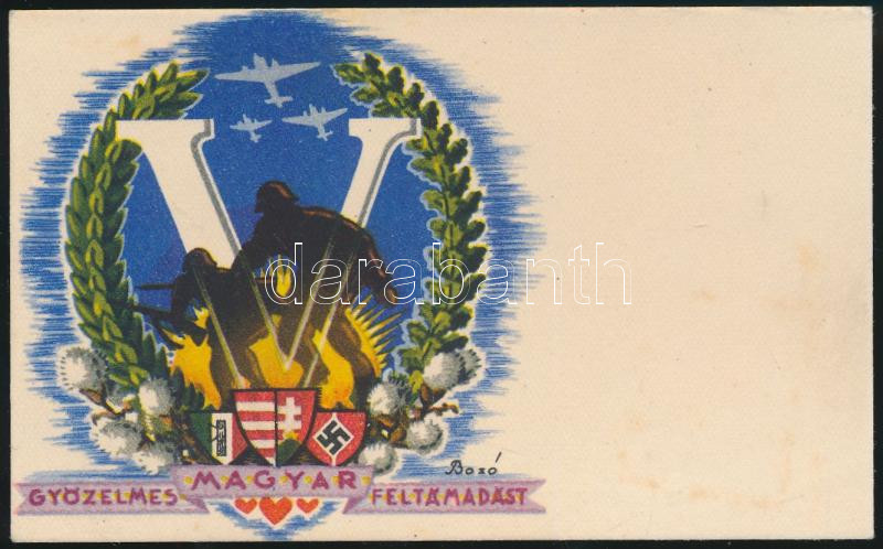 1942 Nagykároly, "Győzelmes magyar feltámadást" Népies irredenta üdvözlőkártya horogkeresztes német és fasiszta olasz címerrel, Bozó jelzéssel / Irredenta card with national socialist coat of arms, minicard, 11×7 cm