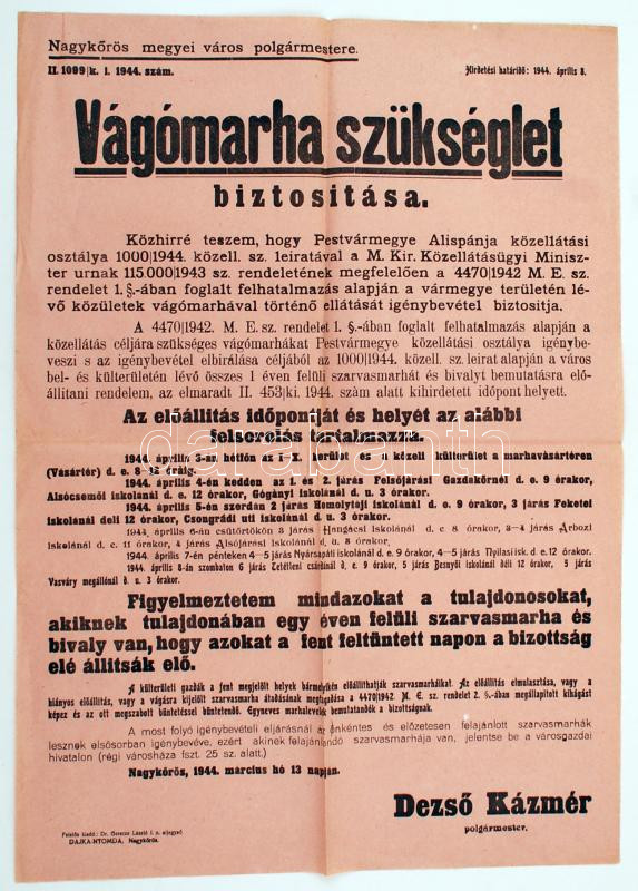 1944 Nagykőrös város vágómarha előállítás hirdetménye 42x60 cm https://www.darabanth.com/de/243-Fernauktion/243.0/Andere-Sammelgebiete/Drucksachen~400007/1944-Nagykoros-varos-vagomarha-eloallitas-hirdetmenye-42x60-cm~II1140874