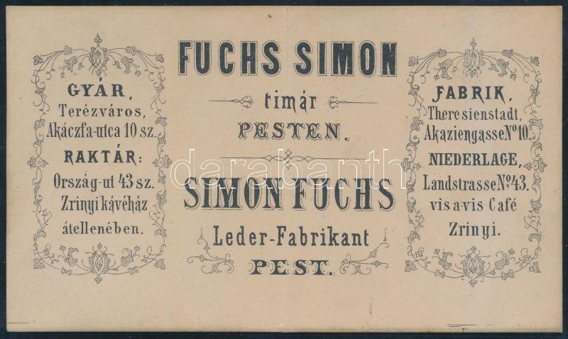 cca 1840 Pest, Fuchs Simon tímár reklámkártyája német és magyar nyelve... https://www.darabanth.com/de/243-Fernauktion/243.0/Andere-Sammelgebiete/Drucksachen~400007/cca-1840-Pest-Fuchs-Simon-timar-reklamkartyaja-nemet-es-magyar-nyelven~II1139734