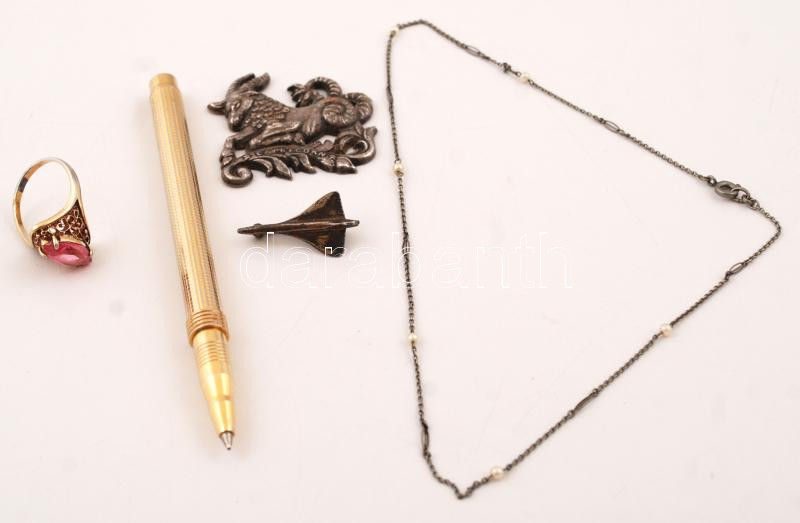 Beschreibung: 5 db-os bizsu tétel, aranyszínű gyűrűvel, repülő alakú kitűzővel, nyaklánccal, tollal