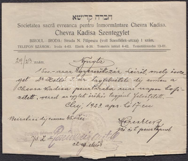 1923-1942 3 db izraelita vallású személy számára kiállított okmány(születési anyakönyvi kivonat, Chevra Kadisa Szentegylet által kiállított nyugta, katonai okmány-rajta második osztályú ezüst vitézségi érem adományozásáról szóló megjegyzéssel)
