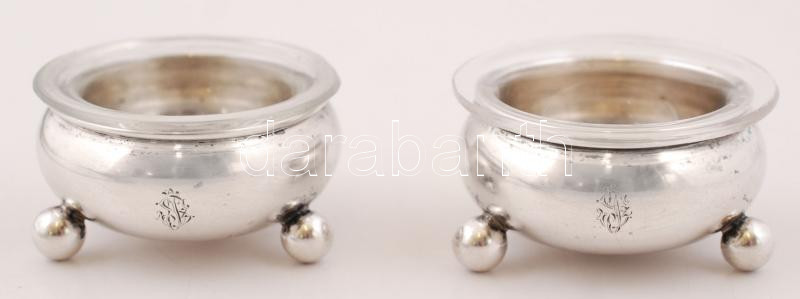 Beschreibung: Ezüst (Ag.) fűszertartó párban, jelzett, mesterjeggyel, üvegen apró lepattanás, d:4,5 cm (2×), nettó:56 g