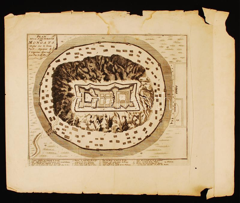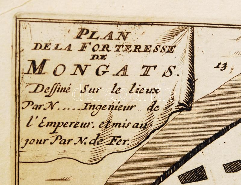 1692 Nicolas de Fer: Plan de la Fortresse Mongats - A munkácsi vár tervrajza. Az Introduction á la fortification c. munkájából. Paris, 1692. Rézmetszet. Méret: 20×25 cm. Lapméret: 34x29 cm. / Map of Munkacevo. Etching