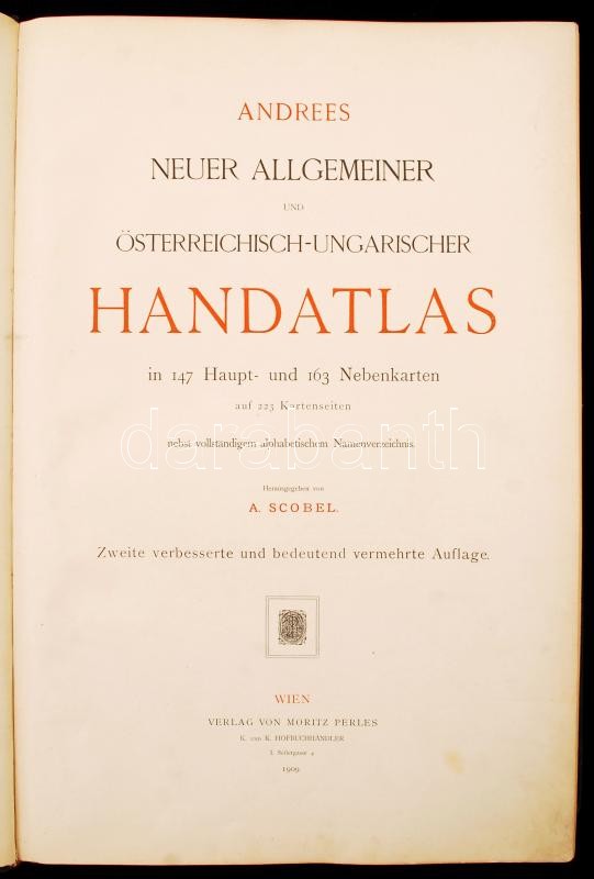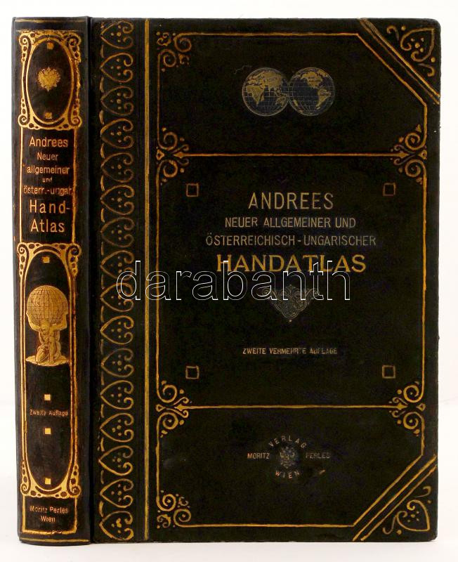 Andrees neuer allgemeiner und Österreichisch- Ungarischer Handatlas. In 126 Haupt- und 131 Nebenkarten. Hrsg. Scobel, A. 2. kiad. Bécs, 1909, Verlag von Moritz Perles. Gazdagon díszített, aranyozott, kissé kopott félbőr kötésben, egyébként jó állapotban.