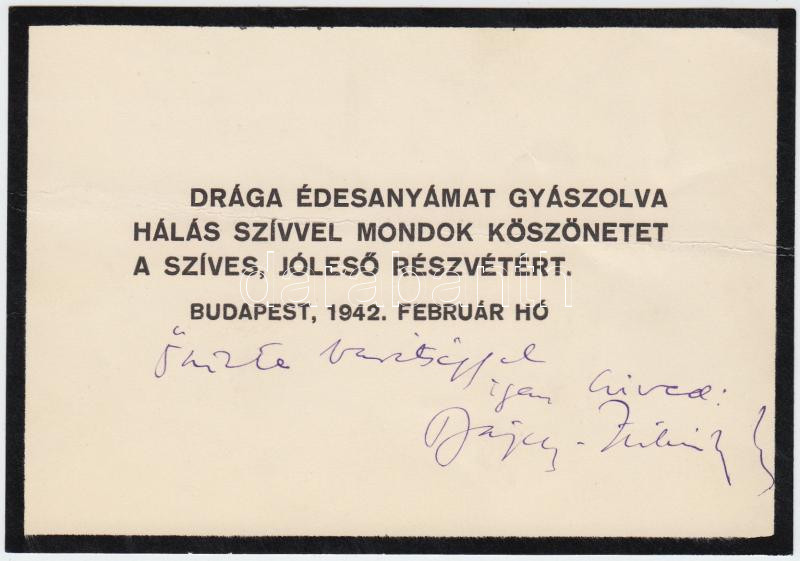 Beschreibung: 1942 Bajcsy Zsilinszky Endre saját kezű aláírása üdvözlőkártyán