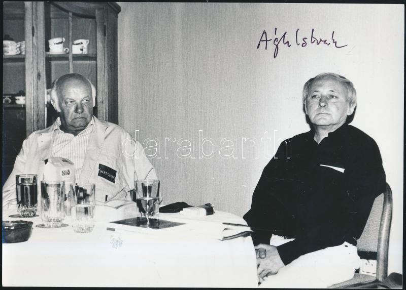 Ágh István, (1938-) Kossuth és József Attila-díjas magyar költő, író, műfordító. A Magyar Művészeti Akadémia Irodalmi Tagozatának tagja. Aláírás az őt ábrázoló fényképen. Fotó Karai s., Irodalmi Kávéház, emlékezés Nagy Lászlóra. 13x18cm
